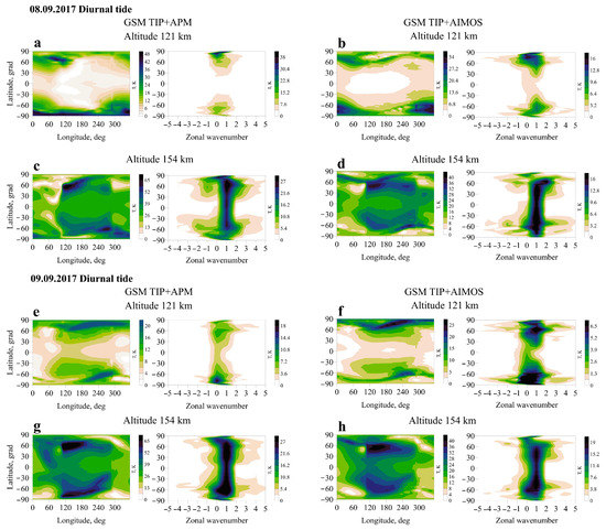 Spatial distribution of the amplitude of the diurnal tide in temperature and the spectrum of tidal waves at heights of 121 km (a,b,e,f) and 154 km (c,d,g,h) according to the results of calculations in the GSMTIP + APM (left) and GSMTIP + AIMOS (right) variants in a geomagnetic disturbance period on 8–9 September 2017.