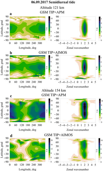 At high latitudes, the role of nonmigrating tides SW0 and SW1 is increased. It may also be noted that at 121 km, the high-latitude local maximum of the SW amplitude in GSM TIP simulations using the AIMOS version is associated precisely with nonmigrating tides. The amplitude of the semidiurnal tide at high latitudes is less than the APM version of the simulation. At 154 km (Figure 4c,d), the tidal structure is determined by waves with zonal wave numbers s = −1, 0, 2, the same as at 121 km. The maximum values of the amplitude of the semidiurnal tide are located at low latitudes. Note that the amplitude of the semidiurnal tide at 121 km in the simulations with AIMOS is larger than in the version with APM, and at an altitude of 154 km, it is smaller. Figure 5 shows the same as in Figure 4 but on geomagnetically disturbed days. During the geomagnetic storm (8 September 2017) at an altitude of 121 km, the amplitude of the semidiurnal tide increased from 12 K to 24 K at high latitudes and slightly increased at middle and low latitudes. The amplification of the semidiurnal tide in the APM version is especially noticeable. Disturbances in the structure of the semidiurnal tide in both versions of the simulation occur due to the amplification of nonmigrating tides with wave numbers s = −2, −1, 0, 1, 3 at high and s = 0 at equatorial latitudes. In the APM version of the GSM TIP simulation, the SW0 component becomes dominant at high latitudes. On 9 September, the amplitudes of semidiurnal tides return to pre-storm values in both versions of the simulation; however, the post-storm structure of tidal waves differs markedly from pre-storm ones by the presence of two minima in the longitudinal sectors 30°–60° and 180°–220°. In the spectra of the semidiurnal tide, along with SW2, the SW0 wave is clearly distinguished.