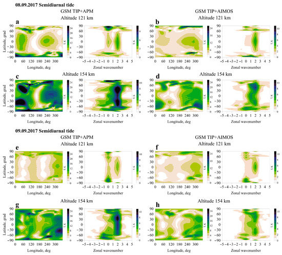 Spatial distribution of the amplitude of the semidiurnal tide in temperature and the spectrum of tidal waves at heights of 121 km (a,b,e,f) and 154 km (c,d,g,h) according to the results of calculations in the GSMTIP + APM (left) and GSMTIP + AIMOS (right) variants on a geomagnetic disturbance period on 8–9 September 2017.