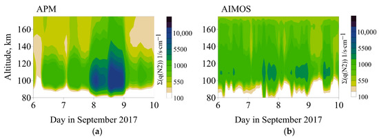 Altitude profiles of longitude and latitude-integrated molecular nitrogen ionization rates (in logarithmic scale) from 90° N to 60° N for the APM variant (a) and AIMOS (b).