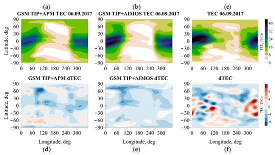 Total electron content (ionospheric TEC) values for the two versions of the TIP GSM calculation with the APM model (a,d), AIMOS (b,e), and the experimental TEC map at 13 UT 6 September (c) and the ΔTEC disturbance at 13 UT 8 September (f).