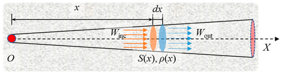 The laser propagation in a coal dust environment is shown in Figure 1. It is assumed that the incident power at a distance x from the light source O is , the effective cross-sectional area is S(x), and the number density of particles is ρ(x). Further, considering the single scattering of multiple particles, the output power at the position x is