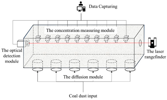 Advanced digital technologies, such as artificial intelligence, are gradually transforming the mining industry. The intelligent system, by accurately monitoring equipment location on fully mechanized mining faces in real-time, can effectively adjust their pose by incorporating the geological model. During the coal mining process, the laser rangefinder plays an important role as a high-precision distance measurement system [1,2,3]. Unfortunately, due to poor ventilation and complex working environments in coal mines, a high concentration of dust particles inevitably absorbs and scatters the laser signal transmitted by the instruments [4]. This absorption can cause a loss of ranging and orientation accuracy or even system failure. Existing reports on coal dust treatment and prevention mainly focus on studying the diffusion characteristics of dust and enhancing dust removal efficiency using numerical simulations and pragmatic experiments [5,6,7,8,9,10]. However, the diffusion of coal dust is unavoidable in crucial regions such as roads and mining faces, affecting the performance of laser instruments severely.