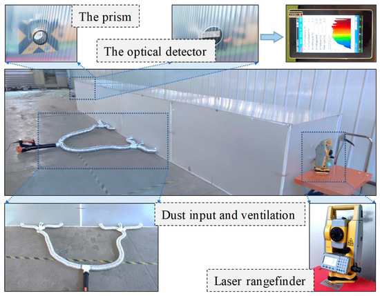Figure 3 and Figure 4 depict the experimental components. A total station serves as the laser transmitter and rangefinder, and an optical detector measures the laser power and wavelength. A prism acts as a cooperative target for the rangefinder. The diffusion module comprises an acrylic box, a blast blower, and several pipes. The concentration measurement module consists of a precision balance, a dust concentration meter, and a series of sampling position labels.