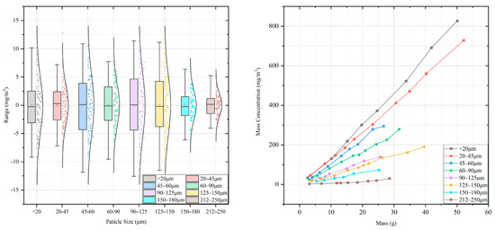 The statistical analysis results for each sampling point are shown in Figure 6. It can be seen that in the same particle size group, the bias value (i.e., the difference between the measured and average values of the mass concentration) has an approximately normal distribution with 0 as the expectation value. In addition, the standard deviations of the measured values are less than 5.22 mg/m3. Furthermore, it is clear from Figure 6 that in the same particle size group, the average dust mass concentration in the propagation path is almost linearly proportional to the input mass. Further, when the input mass remains the same, the larger the particle size, the lower the average concentration.