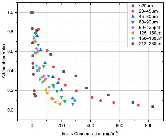 Due to the extinction effect of coal dust particles on electromagnetic waves, the intensity of the laser signal is attenuated when it reaches the receiver through the coal dust environment. After the coal dust material was divided into groups based on the particle size, experiments were conducted under varying masses, and the corresponding power attenuation ratio data were obtained. The results are shown in Figure 7.