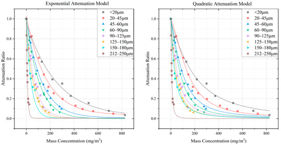 It can be seen in Figure 7 that at the same particle size level, the increase in the mass concentration aggravates the power attenuation, but the attenuation speed gradually decreases with the increase in the mass concentration. The obtained plots were fitted with exponential attenuation () and quadratic attenuation () functions, and the results are shown in Figure 8 and Table 2.