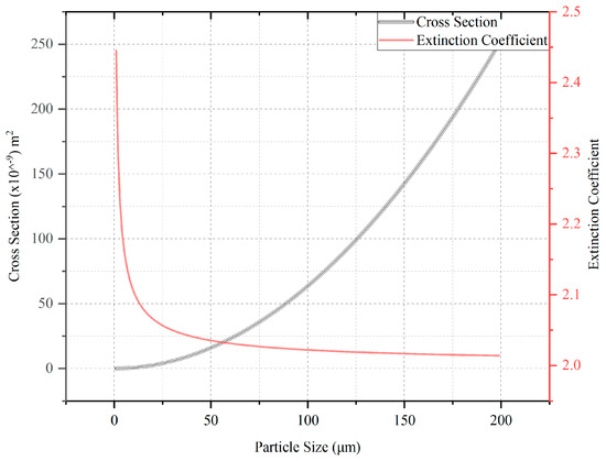 It is clear from Figure 8 that under the same mass concentration, the larger the particle size, the more intense the attenuation. This may be attributed to the fact that the extinction cross section of coal dust particles with larger size is larger. To verify these results, Equation (10) is used to calculate the extinction cross section and extinction coefficient of the coal dust particles with sizes ranging from 1 μm to 200 μm.