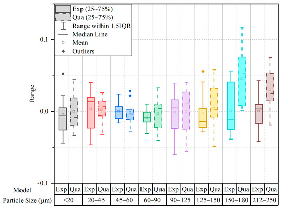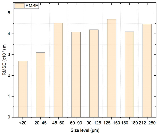where denotes the RMSE at the particle size level r, Δ denotes the true error, and denotes the theoretical correction value, which is calculated by Equation (6). According to Equation (18), the average RMSE results for each particle size level are obtained, as shown in Table 5 and Figure 16.