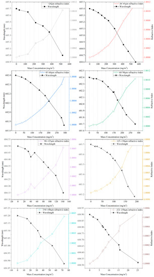 With the laser wavelength measured in a dust-free environment as the benchmark, the relative variations in the laser wavelength under different coal dust particle sizes and mass concentrations were determined. The relative refractive index was calculated using Equation (13). The results are shown in Figure 13.