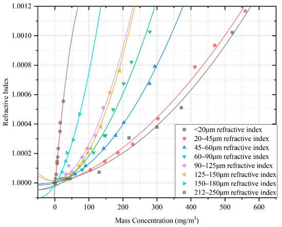 Figure 13 shows that with the increase in the coal dust mass concentration, the laser wavelength decreases, while the relative refractive index increases, and their growth rates increase with the increase in coal dust mass concentration. A polynomial model was used to fit the obtained curves at each particle size level. The results and relevant parameters are shown in Figure 14 and Table 4, respectively.