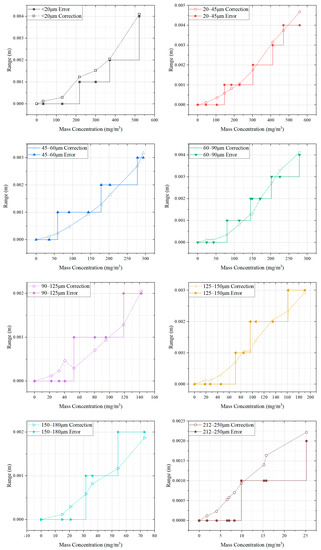 As shown in Figure 14, with the increase in particle size, the growth of the relative refractive index becomes more rapid. This change can be quantitatively expressed using the data in Table 4. In addition, an increase in the refractive index implies a decrease in the laser propagation speed, which can introduce errors into the rangefinder, making the measured value smaller than the actual distance. According to Equation (7), the range correction value can be calculated, and its comparison with the true value is shown in Figure 15.