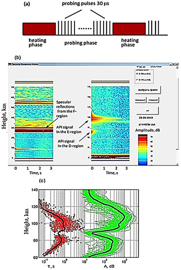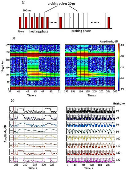 Figure 2a shows a time diagram for studying only the process of API relaxation. It implements a continuous heating mode for several seconds, followed by switching the heating installation to a pulsed diagnostic mode with the emitting of short 30 μs pulses. In both cases of continuous and quasi-continuous heating, the receiving unit of the partial reflection setup receives the signal scattered by inhomogeneities and registers its amplitude and phase during the entire period of their relaxation [21,25,26]. The signal-to-noise ratio is 10–100 at altitudes of 60–130 km.