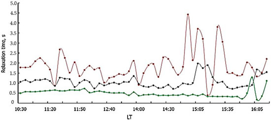Temporal dependence of the relaxation time for three altitudes, i.e., 100.8 km (in red), 105 km (in black) and 112 km (in green) on 25 October 2018. Wavelike variations are caused by the propagation of atmospheric waves (see also [42,43,44,45,46]).