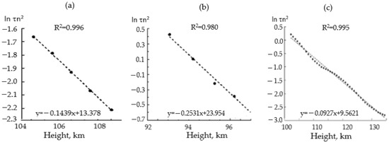 Examples of applying of the linear regression procedure to the experimental function ln (τn2) versus the height: (a) and (b) show two sessions on 4 October 2007 over 4 km smoothing interval and (c) over the entire altitude interval on 2 September 2021.