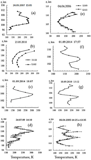 In many temperature profiles, minima of the temperature above 100 km were observed. Such profiles are shown in Figure 5, Figure 6 and Figure 8. Minima can appear as a result of the influence of various processes. They can arise due to the shift of the mesopause from 89–90 km to the region of heights above 90 km. There may also be a two-level mesopause effect, often occurring at equinoxes. In this case, the second temperature minimum appears near 100 km, as was shown in [55]. Probably, this effect can be observed not only at the equinox.