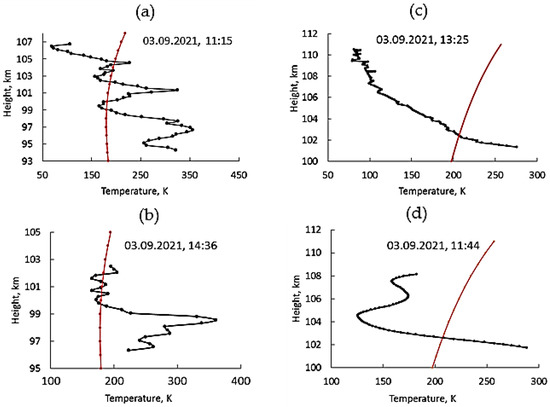 Height temperature profiles in the lower thermosphere measured by the API technique on 3 September 2021 (a–d). Smooth profiles with a minimum or maximum at a certain height (d); smooth monotonic profiles includes profiles without a pronounced extremum (c); the irregular temperature profiles (a,b). The red lines show the vertical temperature profiles calculated according to the MSIS-E-90 model.