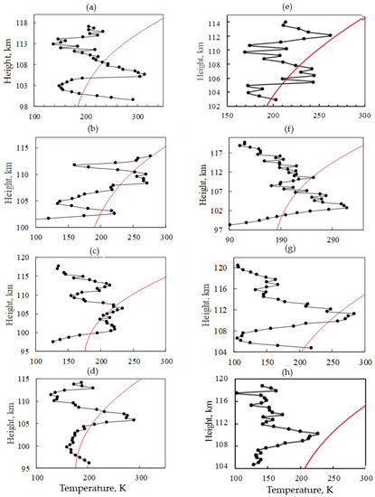 Note that Figure 5 shows the temperature profiles calculated using real electron density profiles N(z) measured by the API technique. The method of the N(z) measurement is described in detail in [37,38]. The temperature profiles shown in Figure 6 were obtained using the vertical electron density profile calculated according to the IRI-2016 model specifically for the measurement time [40].On some profiles, a negative temperature gradient from 10 to 20 K or more can form; for example, dT/dz =–14 K on the bottom part of Figure 5e. Often after this, the profile is transformed into a similar one shown in Figure 5d,h.