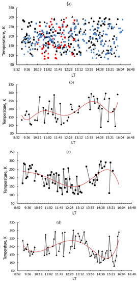 Figure 8a shows temporal temperature variations at three altitudes during the daytime on 24–26 October 2018. Different labels mark the temperature values at different altitudes: triangles refer to 100 km, squares to 105 km, and circles to 112 km. Temperature measurements on 24 October 2018 are shown in blue, 25 October in red and 26 October in black. Figure 8 shows that during these three days, there was a large scatter of temperature values from 85 K to 300 K. The average temperature at altitudes of 100–112 km was 190 K. Figure 8b,c,d show temperature versus time for 26 October 2018 only, for altitudes of 100 km, 105 km, and 112 km, respectively. The red line on the figures shows a polynomial trend of the 6th order. This is one of the simplest ways to estimate the periods of wave-like variations.