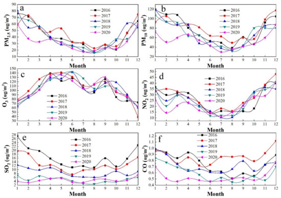 3.3. Monthly Variation of Air Pollutant Concentrations