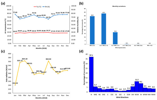 The microclimate variations in Masjid Jamek from January to December 2018. (a) Air temperature (°C) and relative humidity (%); (b) wind speed variation (m/s); (c) solar radiation (W/m2); and (d) wind direction (°).