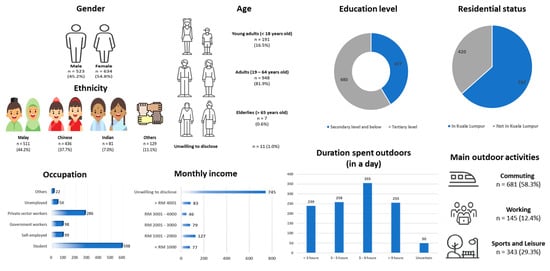 The respondents in the study area consisted mainly of the daytime population. Hence, it is difficult to clarify the length of residence in the city. Alternatively, a question was asked about the duration of hours spent outdoors and the purpose of being outdoors. On average, the respondents spent nearly 6 h (SD = 4.0 h) outdoors in a day for activities such as commuting (n = 681, 58.3%), working (n = 145, 12.4%) and doing sports and leisure (n = 343, 29.3%). The sociodemographic characteristics of the respondents are presented in Figure 4.