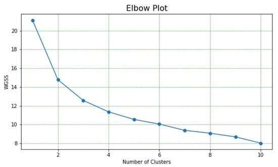 Before the clustering and modeling phases were carried out, the training set was scaled into a range of [0, 1] by adopting min–max normalization. Then, the 60 monitoring stations were clustered based on the k-means algorithm. To identify the optimum clusters, the values of WGSS were calculated and visualized in Figure 3 for .