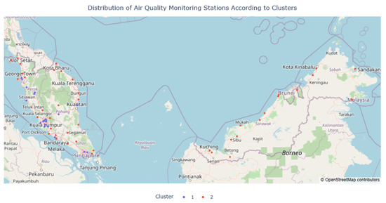 It was found that most stations in Cluster 1 are in the more developed states along the west coast of Peninsular Malaysia, such as Selangor, Perak, Pulau Pinang and Kuala Lumpur. On the other hand, Cluster 2 is mainly made up of stations that are widely distributed in the less developed states around the east coast of Peninsular Malaysia and east Malaysia, including Terengganu, Kelantan, Sabah and Sarawak.
