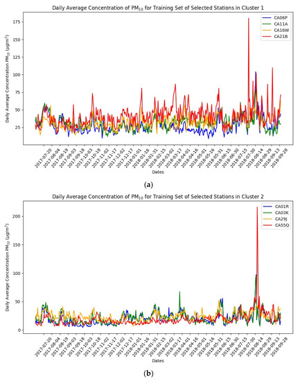 Time plots of daily average concentration of PM10 for training set of selected stations in each cluster: (a) Cluster 1; (b) Cluster 2.