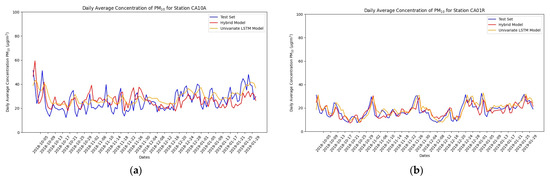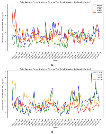Time plots of daily average concentration of PM10 for test set of selected stations in each cluster: (a) Cluster 1; (b) Cluster 2.