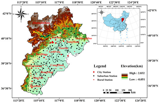 Our analysis was based on the daily temperature data from 174 meteorological stations in the Beijing–Tianjin–Hebei (BTH) region for 42 summers (June, July, and August) from 1979 to 2020. The original temperature data for each station were obtained from the National Meteorological Information Center of the China Meteorological Administration (http://data.cma.cn/, accessed on 5 May 2022), and the quality of the data was strictly controlled. None of these stations missed more than 5% of measurements during the study period. Among the 174 stations, there were 20 stations in Beijing City, 12 stations in Tianjin City, and 142 stations in Hebei Province. The BTH region presents topographic characteristics of the high northwest and the low southeast regions, and the height of the station increases from south to north. According to historical data, topographic features, and geographical distribution maps, the BTH region was divided into six regions: Beijing City, Tianjin City, Northern Hebei (Zhangjiakou and Chengde), Eastern Hebei (Qinhuangdao and Tangshan), Central Hebei (Shijiazhuang, Hengshui, Baoding, Cangzhou, and Langfang), and Southern Hebei (Xingtai and Handan). The locations of these stations and the topography of the BTH region are shown in Figure 1.