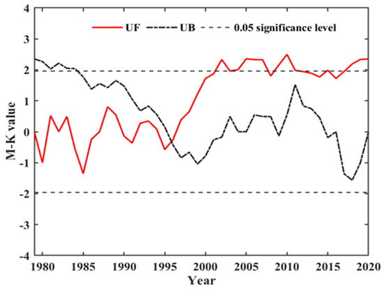 We used a linear regression method to analyze the trends in extreme heat events, and we used the Mann–Kendall test to identify whether there were transitions in changes in TXx over the BTH region. As shown in Figure 2, the results of the Mann–Kendall test indicated a transition in the mid-1990s (UB and UF are parameters of the M–K test). Therefore, we separated the study period into two periods to further study the interdecadal variation of extreme heat events over the BTH region: P1 was for the period from 1979 to 1994, and P2 was for 1997 to 2020. In addition, the linregress function in Python was used to test the significance of the linear trend of extreme heat events at each station over the BTH region. Finally, Kriging interpolation was used to characterize the spatial distribution of extreme heat events.