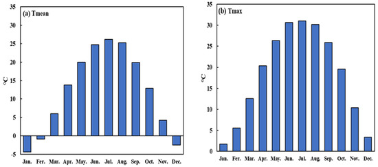 Monthly mean values of daily mean temperatures (a) and daily maximum temperatures (b) for 1979 to 2020 over the BTH region.