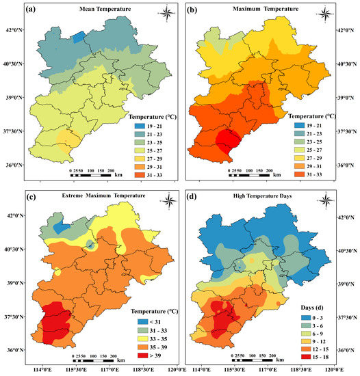 There were temperature gradients between the south and north of the BTH region, where the summer mean values of both daily mean temperatures (Figure 4a) and daily maximum temperatures (Figure 4b) were higher in the south and lower in the north. The summer mean values of daily mean temperatures and daily maximum temperatures ranged from 25 to 27 °C and from 31 to 33 °C, respectively, in areas south of 40° N, and they ranged from 21 to 25 °C and from 27 to 31 °C, respectively, in areas north of 40° N. This spatial pattern of being higher in the south and lower in the north was also detected in the temperature extremes. Over regions south of 40° N, TXx was usually higher than 35 °C, and the highest values, above 39 °C, were detected over the southern parts of Hebei Province (Figure 4c). Consistent with TXx, the Htd value was higher in the south and lower in the north of BTH region (Figure 4d). Htd was 15 to 18 d over the southern parts of Hebei Province, while it was only 0 to 3 over the regions north of 40° N.