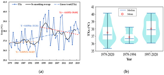 The violin plot of TXx during different periods also showed clear interdecadal differences between P1 and P2 (Figure 5b). Obviously higher values and larger interannual variabilities were observed during P2. During P1, the value of TXx was mainly concentrated between 36 °C and 37 °C, with a mean value of 37 °C. However, during P2, it mainly concentrated in the temperature ranges of 37 °C to 38 °C and 39 to 40 °C, with a mean value of 38 °C. The mean value for P2 was higher than both that for P1 and that for the entire study period. In general, against the background of global warming, TXx in the BTH region showed an increasing trend during the whole study period, and it showed obvious interdecadal variation characteristics.
