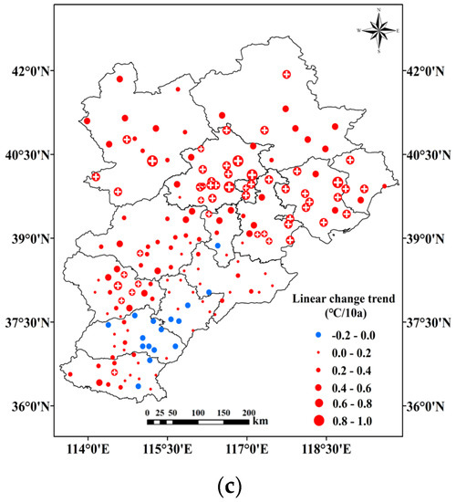 Almost the entire BTH region showed an increasing trend for Htd, and it decreased at only three stations, with values from −0.2 to 0.0 d/10a (Figure 7c). Most of the stations in the three major cities, Beijing City, Tianjin City, and Shijiazhuang City, had relatively large growth rates and a significant increasing trend (passing the 99%-significance test).