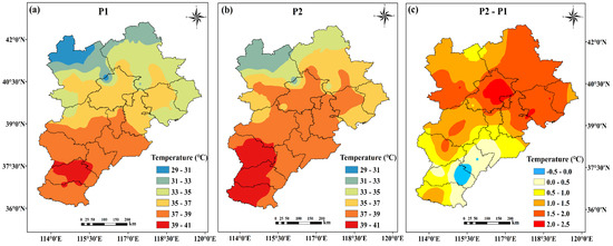 An evident rise in TXx was observed over nearly the entire BTH region between the two periods, particularly in the northeastern parts. During P1, TXx was usually above 37 °C over Central and Southern Hebei Province, between 35 and 37 °C for Beijing City and Tianjin City and below 35 °C over Northern Hebei Province (Figure 6a). Compared with those during P1, during P2, areas with TXx above 37 °C were extended to Beijing and Tianjin, while areas with relatively high temperatures of 39 °C were extended to Shijiazhuang City in Southern Hebei Province and Central Hebei Province. The area with a relatively low TXx of 35 °C was narrowed to a small part of the northern mountainous area of Northern Hebei Province (Figure 6b).