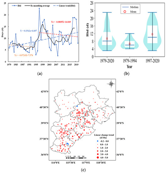 (a) Time series (dot line) and linear trends (dash lines) of Htd over the BTH region during 1979–2020; (b) violin plots of Htd for different periods; (c) linear change trend of Htd (⊕ means that it passed the 99%-significance test).