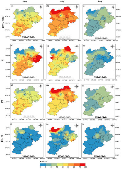 The monthly mean proportion and spatial distribution of Htd had certain regional variation characteristics between different decades over the BTH region. The proportion of Htd decreased in June and increased in July from P1 to P2. This is consistent with the interdecadal change in TXx monthly statistics in Table 2. During P1, the proportion of Htd was relatively high in June, reaching 55.2%. The high value areas were mainly concentrated in Eastern Hebei Province, accounting for more than 70%. During P2, the proportion of Htd was only 38.2% in June. In July, the proportion of Htd was increased in P2, and the area of the high proportion expanded from Chengde City to the northern mountainous Hebei Province. In August, the proportion of Htd was usually below 30% in P1 and P2 over the BTH region. Further analysis of the difference between periods P1 and P2 of Htd over the BTH region was conducted. It can be seen more visually that in June, the proportion of Htd decreased significantly in almost the entire BTH region, except for the mountainous areas in Northern Hebei Province. In particular, the largest decrease in the proportion was observed in Eastern Hebei Province (Figure 8j). In July, the largest increase in Htd was observed in the northern region of Zhangjiakou City in Northern Hebei Province, and the proportion of Htd in Eastern Hebei Province also increased significantly during P2 (Figure 8k). In August, the proportions of Htd in Beijing and Eastern Hebei Province increased significantly, while the rates of increase in Central and Southern Hebei Province were insignificant (Figure 8l).