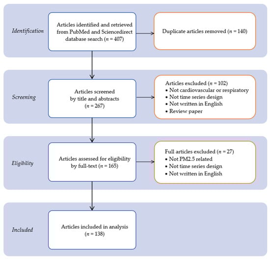 The first step in this review was searching for articles published in online databases, focusing on the effects of PM2.5 on health. The search started in February 2021, using four different keyword combinations, of which a total of 407 potentially relevant articles were identified from the PubMed and Science Direct databases. A total of 140 articles were found to be duplicated and were then removed, leaving only 267 remaining articles. A total of 102 articles were omitted after screening through the titles and abstracts as they were not pertinent to the objective of the study, and 27 more articles were excluded after a full-text review for various reasons, bringing the total number of articles included in this scoping at 138 (Figure 1 and Table S1).