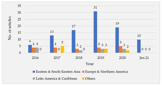 A total of 138 articles were included in this review on PM2.5-related health effects for the 5-years period from January 2016 to January 2021 (Figure 2). The year 2019 had the largest count of articles published (n = 41), while the year 2016 had the lowest (n = 14), excluding the year 2021, which only contained the month of January. The selected time series studies of PM2.5 on cardiovascular and respiratory health outcomes were published from almost all the geographic regions around the world. The majority of PM2.5 time series and health effects studies selected were conducted in the Eastern and South-Eastern Asia region (69.6%), followed by Europe and Northern America (14.5%), and Latin America and the Caribbean (8.7%). Nine articles were published from other regions: Central & Southern Asia (n = 4), Northern Africa & Western Asia (n = 3), and Oceania (n = 2). One multi-country study was conducted in multiple regions on six continents; however, most of the cities were mainly located in East Asia, Europe, and North America, with a smaller number of cities in Latin America and Africa [31].