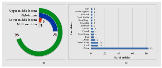 Frequency of time series studies of PM2.5 with health effects by (a) income groups and (b) countries. Notes: Based on GNI per capita in USD by the World Bank Gross National Income (GNI) Economies [31]: High-income > 12,695, Upper-middle income = 4096–12,695, Lower-middle income = 1046–4095.