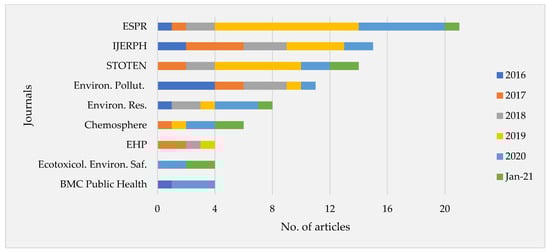 Studies on time series of PM2.5 with cardiovascular and respiratory health effects were interdisciplinary research areas and published in various international journals. More than half of the articles (63.8%) were frequently published in these top 9 journals (Figure 4). The Environmental Science and Pollution Research (ESPR) cumulatively published the highest number of related articles in the 5 years from 2016 to 2021 (n = 21), followed by the International Journal of Environmental Research and Public Health (IJERPH; n = 15) and Science of the Total Environment (STOTEN; n = 14). Other frequently published journals were on the multi-disciplinary application between the environment and health, including the BMC Public Health, Ecotoxicology and Environmental Safety, Environmental Health Perspectives (EHP), Chemosphere, and Environmental Research. The rest of the articles were published less frequently in another 38 journals that focused on environmental sciences (i.e., pollution and toxicology, hygiene, and safety) and health (i.e., public health, medical and clinical).
