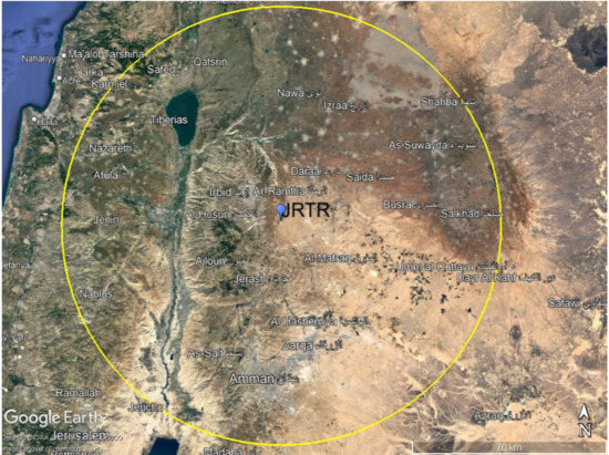The JRTR is located within JUST in Irbid City, Jordan. It is located approximately 70 km north of Amman and 13 km southeast of Irbid. The geographical coordinates of the JRTR are 32.4627° N and 35.9730° E. Ground elevations of the site range from 560 m to 635 m [9]. Figure 1 illustrates the JRTR site and prominent cities within a radius of 80 km.
