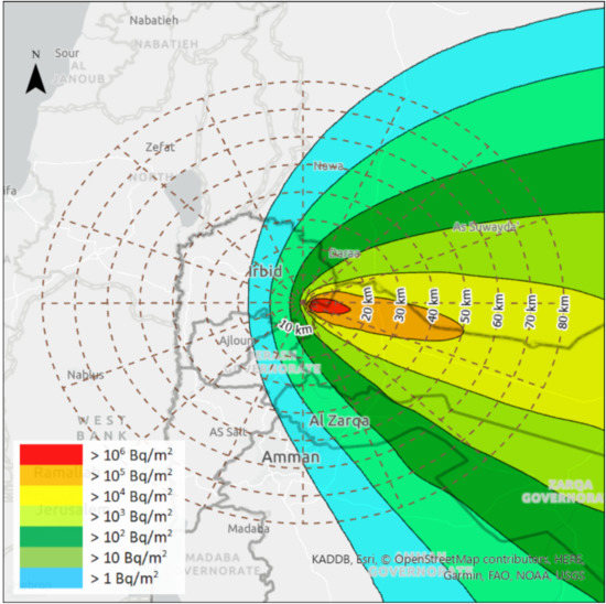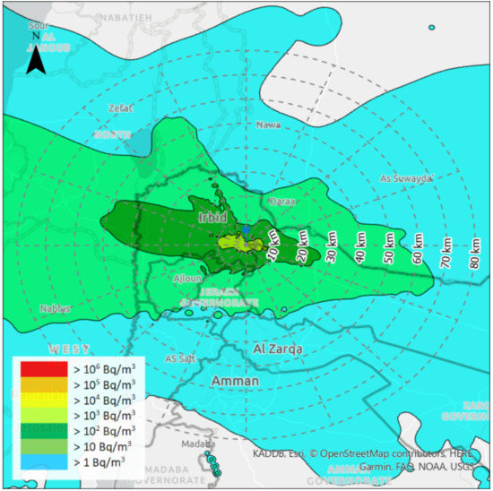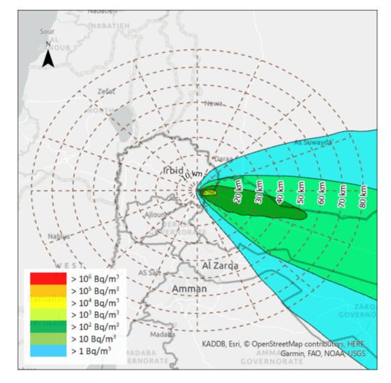 The FSAR [3] and RER [9] for JRTR have identified the complete blockage of a fuel assembly as a limited design basis accident that could result in the most significant release of fission products into the environment. Xoubi [10] additionally considered the scenario of one or more projectiles targeting the reactor building, leading to the destruction of the reactor confinement and pool, ultimately causing damage to all fuel assemblies. Given the absence of a containment building and the potential security threats resulting from the current situation in the Middle East, including the JRTR’s proximity to the Syrian borders, a radiological impact assessment was conducted utilizing the source term provided by Xoubi [10].