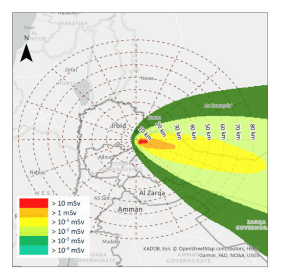 According to Figure 6, although a dose of 1 mSv was calculated more than 20 km to the east of the JRTR site, the affected areas consist of low populated lands, with only a few small communities located within this region. With the exception of the Mafraq governorate, all other governorates received a minimal dose of less than 0.1 mSv. Figure 7 shows that the dose in the area within a 10 km radius of the JRTR site exceeds 1 mSv, impacting the Bani Obeid district, but posing no significant danger to the densely populated Irbid Qasabah district or other districts in the Irbid governorate. Some areas in the Irbid and Mafraq governorates are estimated to receive a dose greater than 1 mSv, while all other governorates receive a very low dose of less than 0.1 mSv. Both Figure 6 and Figure 7 show that even if a severe accident was to damage the JRTR confinement and core, only a limited area is estimated to be at significant risk of high exposure to radioactive materials. Densely populated cities and regions are estimated to receive a minimal dose.
