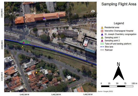 The authors selected the study area in Curitiba (PR), shown in Figure 1, based on three primary considerations: proximity to the laboratory at UFPR for easy equipment transportation, availability of a suitable take-off and landing platform (green area in Figure 1), and the presence of numerous points of interest. These sites include residential blocks near the railroad (yellow triangle). This religious institution aids the socially vulnerable (blue triangle), and the Marcelino Champagnat Hospital provides cardiovascular treatments (red cross). Furthermore, the authors considered a bike lane beside the railroad approximately 5 m above the ground (blue line).