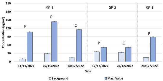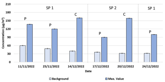 During this study, the authors conducted eight sampling campaigns to measure pollutant concentrations at various points in the study area. Most sampling flights (five campaigns) were performed at point 1, with the final campaign occurring on December 25th to determine the vertical profiles of pollutant concentrations at this location. Adverse meteorological conditions resulted in two campaigns being carried out at point 2. Outliers were removed from the measured data, and the datasets were evaluated for each gaseous substance, as shown in Section 3.1, Section 3.2 and Section 3.3. In these sections, captions were added to the graphs to facilitate comprehension. Measurements made at sampling point one were labeled as SP 1. Meanwhile, tag SP 2 was used over measurements made on sampling point 2. Moreover, cargo trains were labeled with the letter C, and passenger trains with the letter P. Afterwards; Section 3.4 includes the results for the vertical profiles, both before and after the passage of the passenger train.