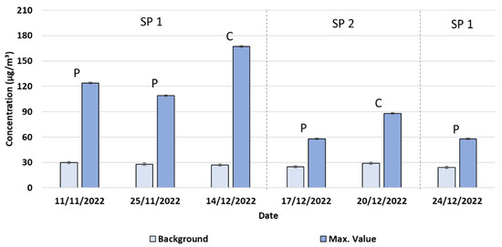 Background and maximum concentrations of SO2 measured during sampling flights. Cargo trains are indicated with the letter C, while passenger trains are indicated with the letter P. SP 1 means measurements over sampling point 1, and SP 2 is related to sampling point 2.