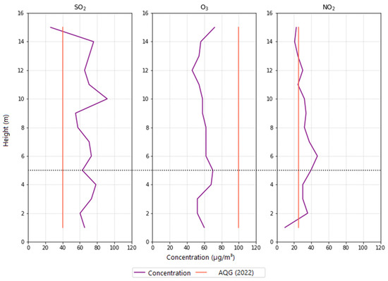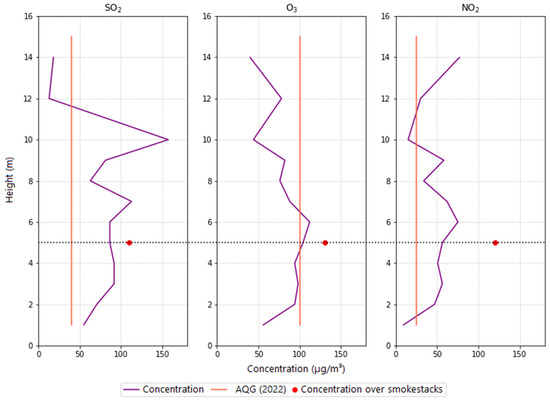 Vertical profiles of SO2, O3, and NO2 were measured 5 min after a passenger train passed over the rail line. The red dots represent the mean concentration measured over the smokestacks of passenger trains. In orange, the WHO defines the air quality guideline for each pollutant.